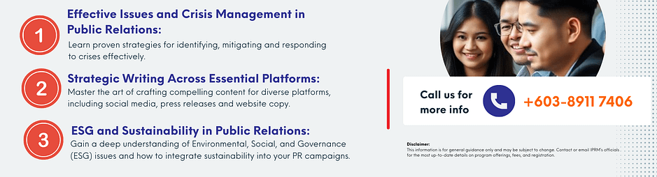 The Institute of Public Relations Malaysia (IPRM) is dedicated to elevating the standards of public relations practice in Malaysia. As an organisation and the leading professional body for public relations practitioners, we are committed to providing high-quality training programmes that equip individuals with the knowledge, skills, and expertise demanded by the dynamic communications landscape. Our training programmes are designed to enhance professional development, foster best practices, and ensure that public relations practitioners in Malaysia remain at the forefront of the industry.
